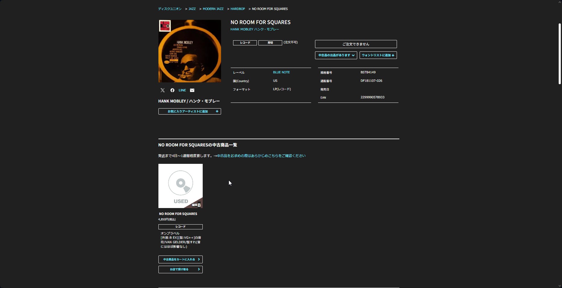 Hank Mobley – No Room For Squares(Blue Note BST-84149, 1977年USリイシュー・ステレオ盤)