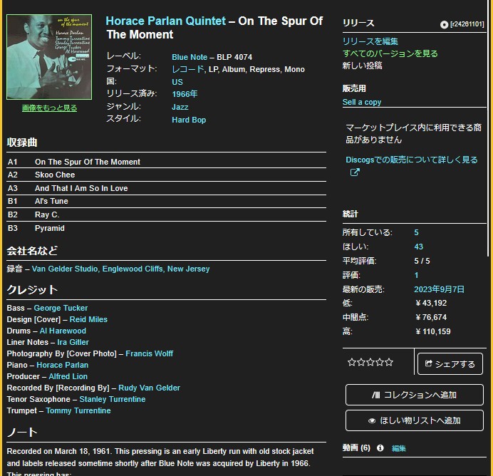 余談:このアルバムは、ホレス・パーランのブルーノートのアルバムながら、価格は他のホレス・パーランの盤に比べると控えめです。理由はホーン楽器にタレンタイン兄弟が参加しているからでしょうか?たしかに、これがもっと別のアーティストだったら・・・と考えなくもないですが、アルバム全体の完成度を考えると十分名作。